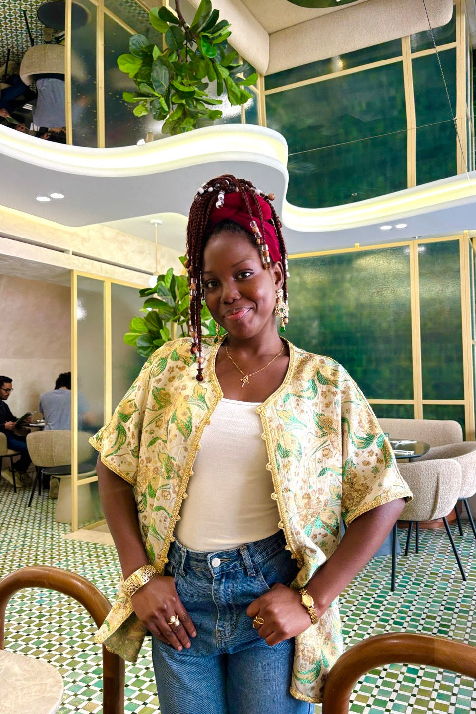 Son tissu brodé aux reflets dorés et verts évoque les jardins orientaux, tandis que les finitions en sfifa dorée et laakad délicat rappellent l’élégance artisanale du Maroc.